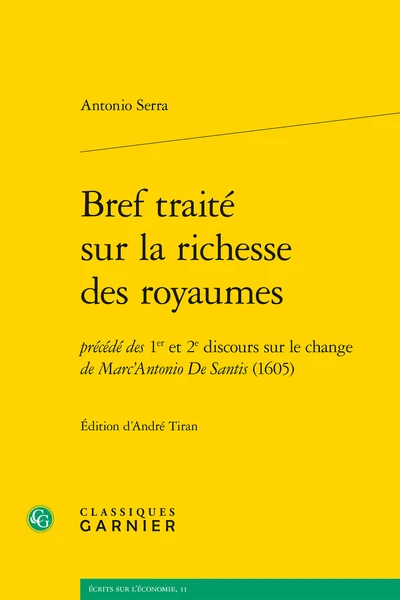 - Résumé : Antonio Serra aurait dû être considéré comme le fondateur de l’économie politique avec son Bref traité (1613) bien avant Adam Smith. Son œuvre n’a cessé de susciter l’intérêt. Les Discours de Marc’ Antonio De Santis (1605) représentent une analyse originale des opérations de spéculation sur le change.