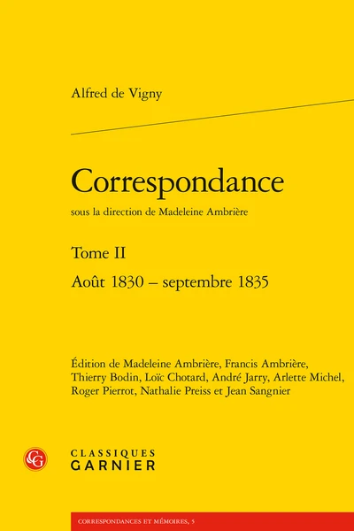 Directrice d’ensemble : Ambrière (Madeleine) - Résumé : Le second volume de la Correspondance d’Alfred de Vigny fait revivre une période capitale de sa vie : l’homme est en proie aux orages de la passion avec la grande actrice Marie Dorval ; le poète et dramaturge met en scène, avec Chatterton, le drame des jeunes écrivains dans la société de la monarchie de Juillet.
