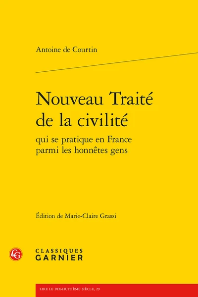 - Résumé : Essai de synthèse entre l’idéal de l’honnête homme mondain et l’idéal moraliste et chrétien, manuel complet de civilité française, ce traité d’Antoine de Courtin présente, outre de nombreuses recommandations pratiques, une réflexion sur les fondements des actes de civilité.