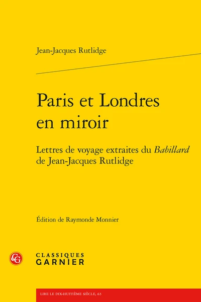 - Résumé : Ces lettres publiées par Jean-Jacques Rutlidge à la fin des années 1770 constituent un essai réussi de son périodique Le Babillard. Le tableau parallèle de Londres et de Paris que deux jeunes voyageurs envoient au journal plonge le lecteur au cœur de la société des villes, de ses intérêts et de ses chimères.